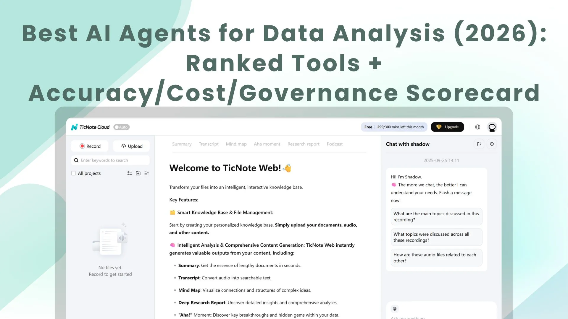What "best" means here: accuracy/correctness, cost to run, latency (time-to-insight), governance/auditability, and data fit (meetings/docs vs warehouse/BI). If your data lives in meetings and docs, start with TicNote Cloud: create a Project, add transcripts/docs, ask Shadow AI for cited answers, then generate your first report or presentation.