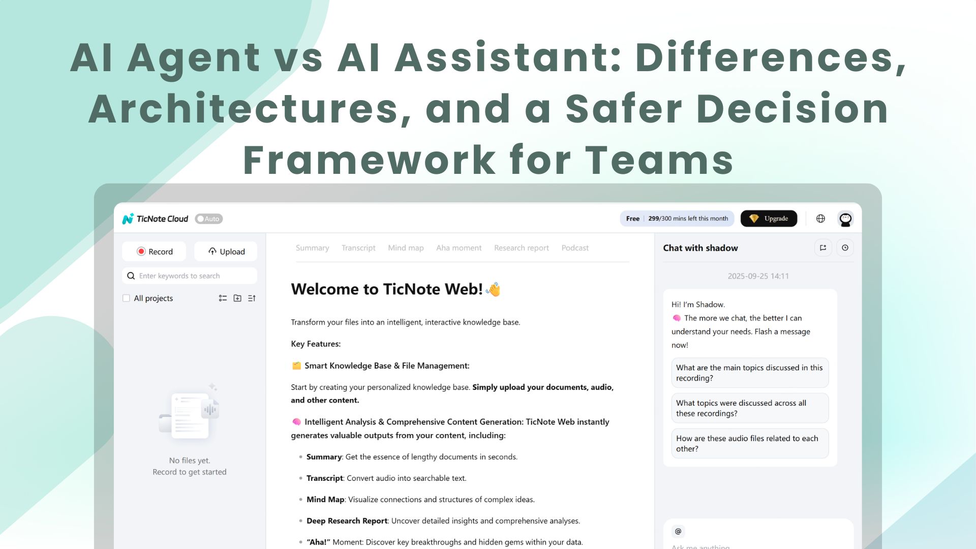 Start with a workflow tool like TicNote Cloud if your team wants meetings to turn into deliverables fast. An AI assistant is prompt-driven help (Q&A, drafting, rewriting). An AI agent is goal-driven execution (it plans steps, uses tools, keeps state), which is why the AI agent vs. AI assistant choice matters most after the call.
