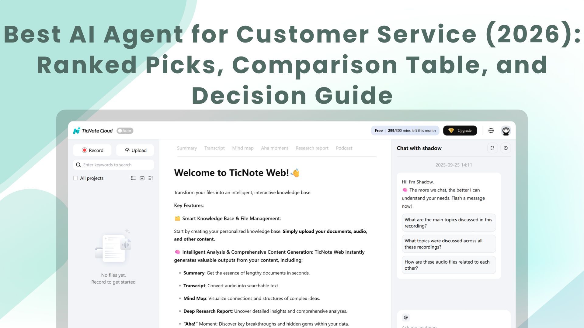 Pick TicNote Cloud if support knowledge starts in calls and screen shares—try TicNote Cloud for free to turn customer conversations into cited summaries, follow-ups, and reusable answers. It's the best AI agent for teams where the "why" lives in meetings, not tickets.