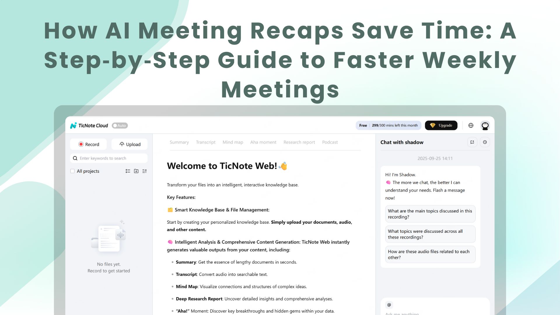 Turn every weekly meeting into searchable knowledge. TicNote Cloud maps the work you already do into modules that speed up meeting recaps and make decisions easy to find later. This section walks through live and post meeting transcription, AI meeting summaries and templates, auto mind maps, Shadow cross-file Q&A, translation, and export options.