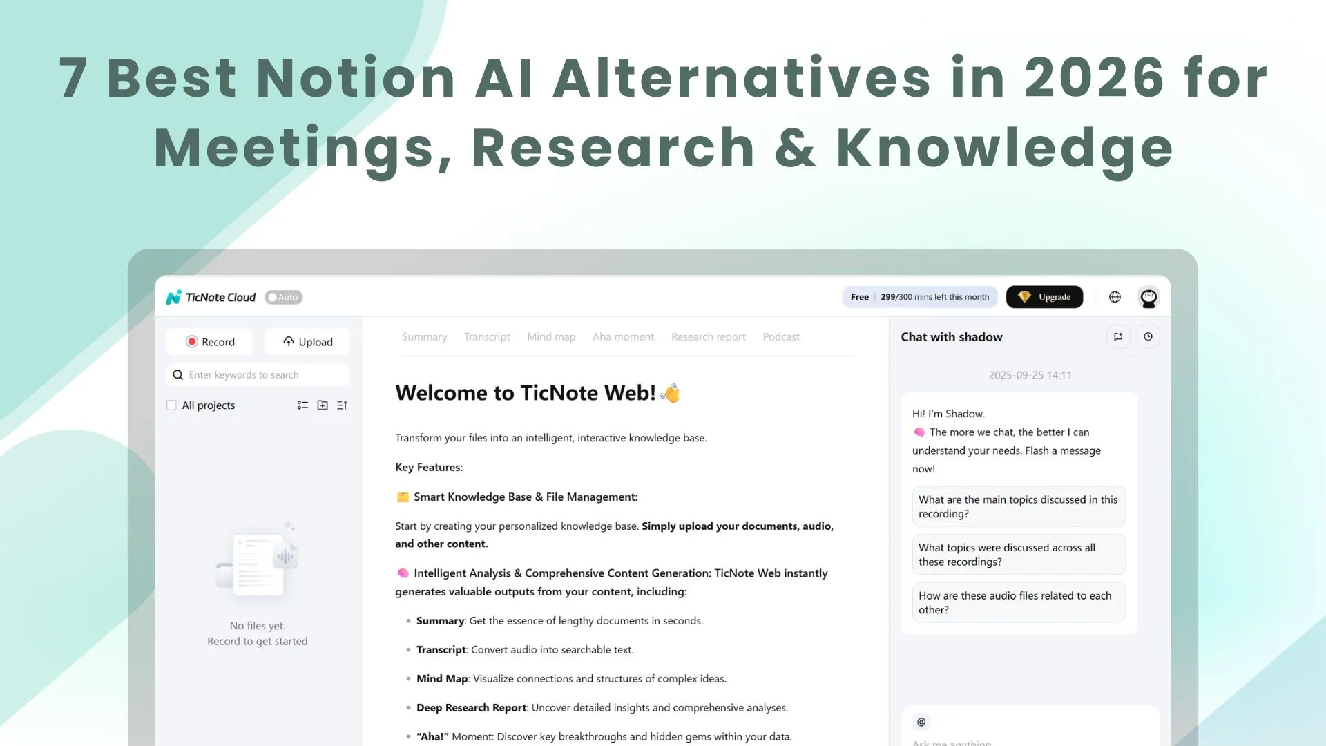 | TicNote Cloud | Conversation-to-deliverable workflows | Shadow Agent, Project-based knowledge, multilingual transcription and translation, reports, decks, podcasts, traceable citations | Free plan includes 300 monthly credits; Pro includes 2,100 monthly credits |