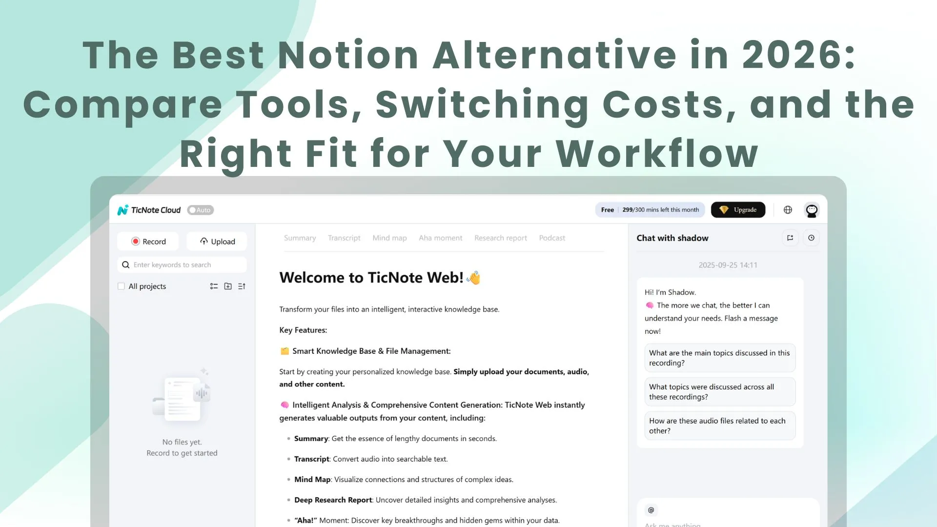 - Need a Notion alternative with AI search for meeting-heavy work: shortlist TicNote Cloud first, then compare how each tool handles cited Q&A and how fast you can go from transcript → action items → report.