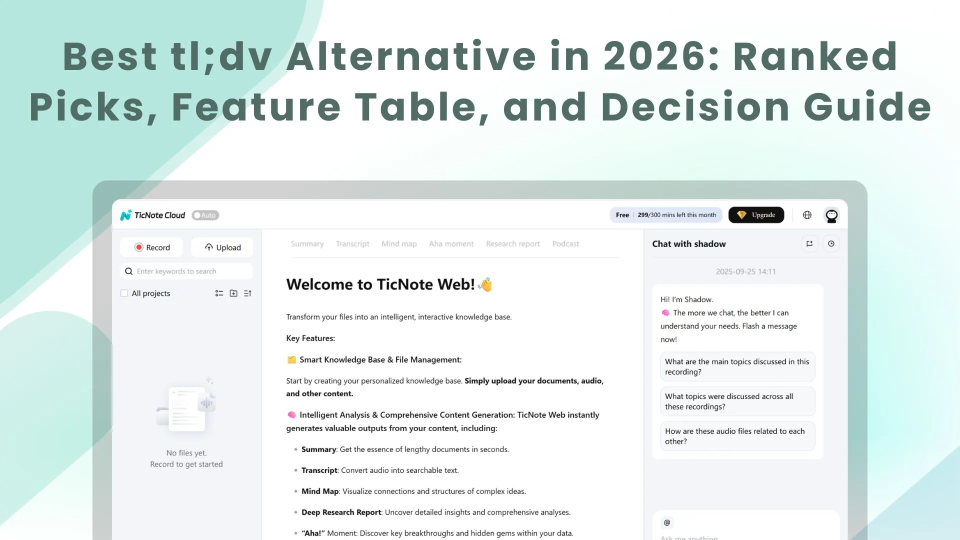 - If you want bot-free capture + project-level knowledge + one-click deliverables, TicNote Cloud is the best overall fit. You get editable transcripts, Project memory across meetings, and fast outputs like reports, presentations, podcasts, and mind maps.