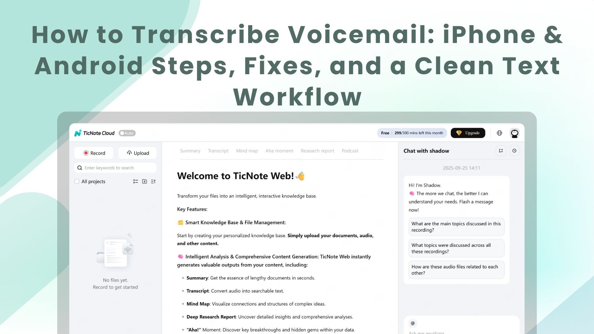 If your phone can’t transcribe voicemail well, you can still get clean text fast. The basic idea is simple: save the voicemail audio, upload it to TicNote Cloud, then turn the transcript into a note you can search later. This workflow also helps when you need to transcribe voicemail that has names, numbers, or an address.