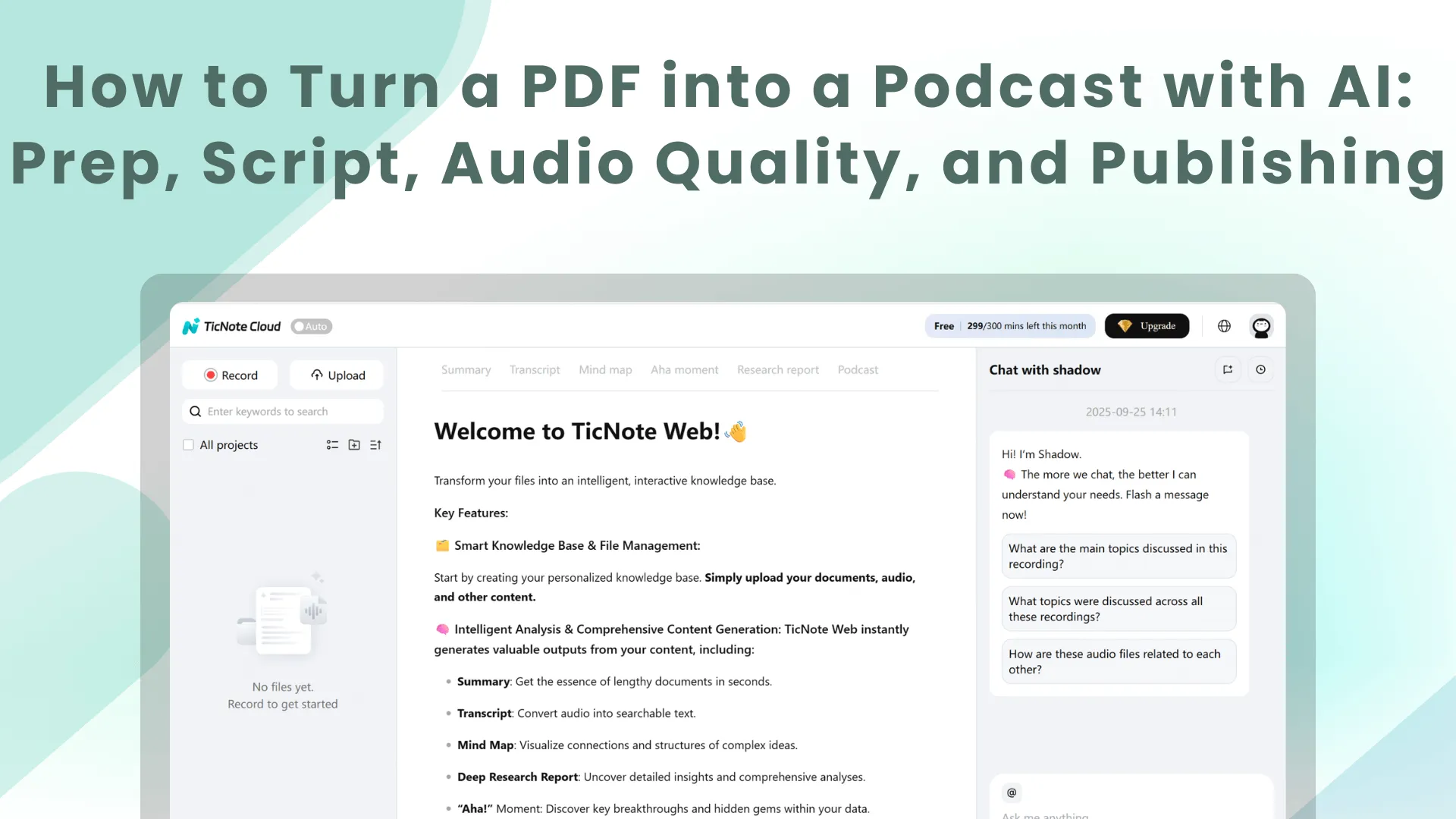TicNote Cloud's Shadow Q&A is useful when a PDF is dense. You can ask for plain-language explanations, define jargon, and turn key sections into listener-first talking points. If you want to move faster, generate your first AI summary in minutes and build the episode from that.