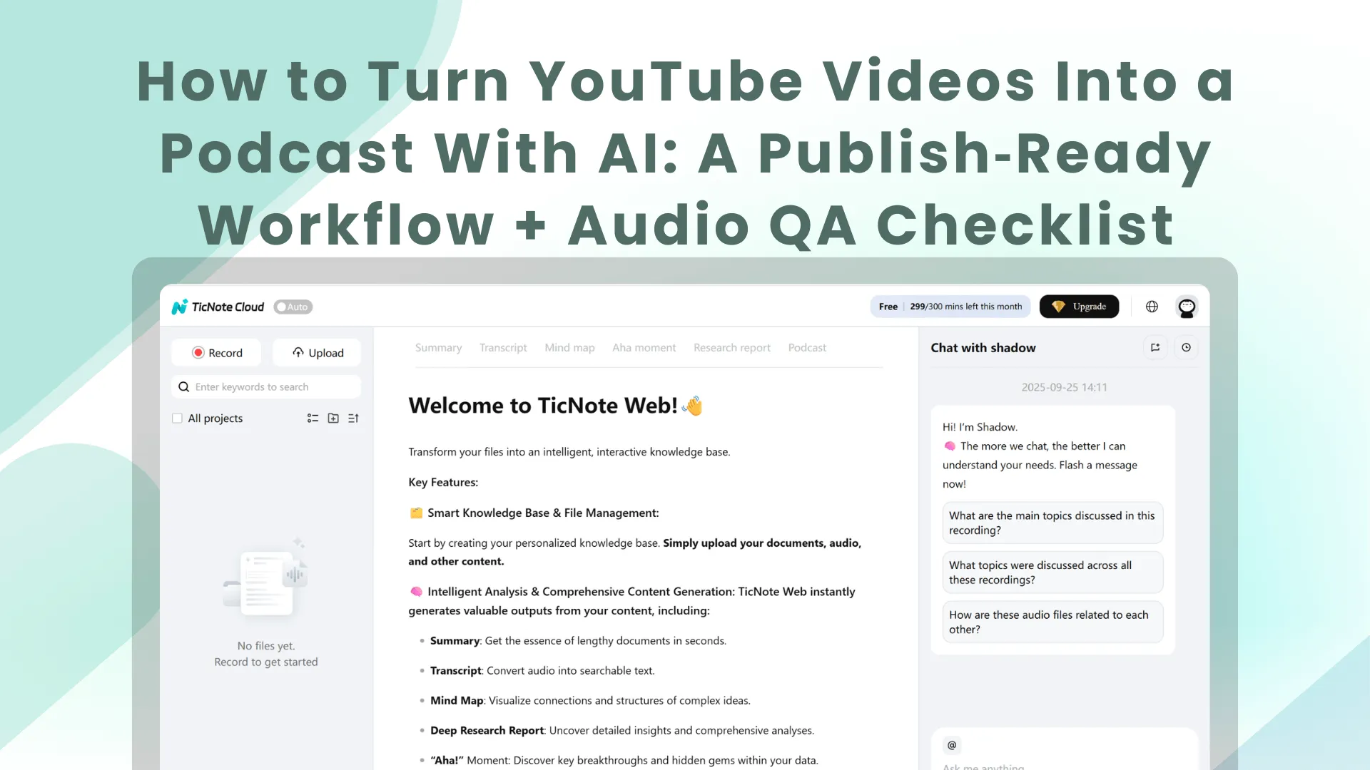 Use an AI workspace like TicNote Cloud to go from video upload to a clean transcript, tight audio edit plan, and publishable podcast assets fast. "Podcast-ready" means it stands alone without visuals, hits loudness targets, and includes notes and chapters, not just an auto-import.