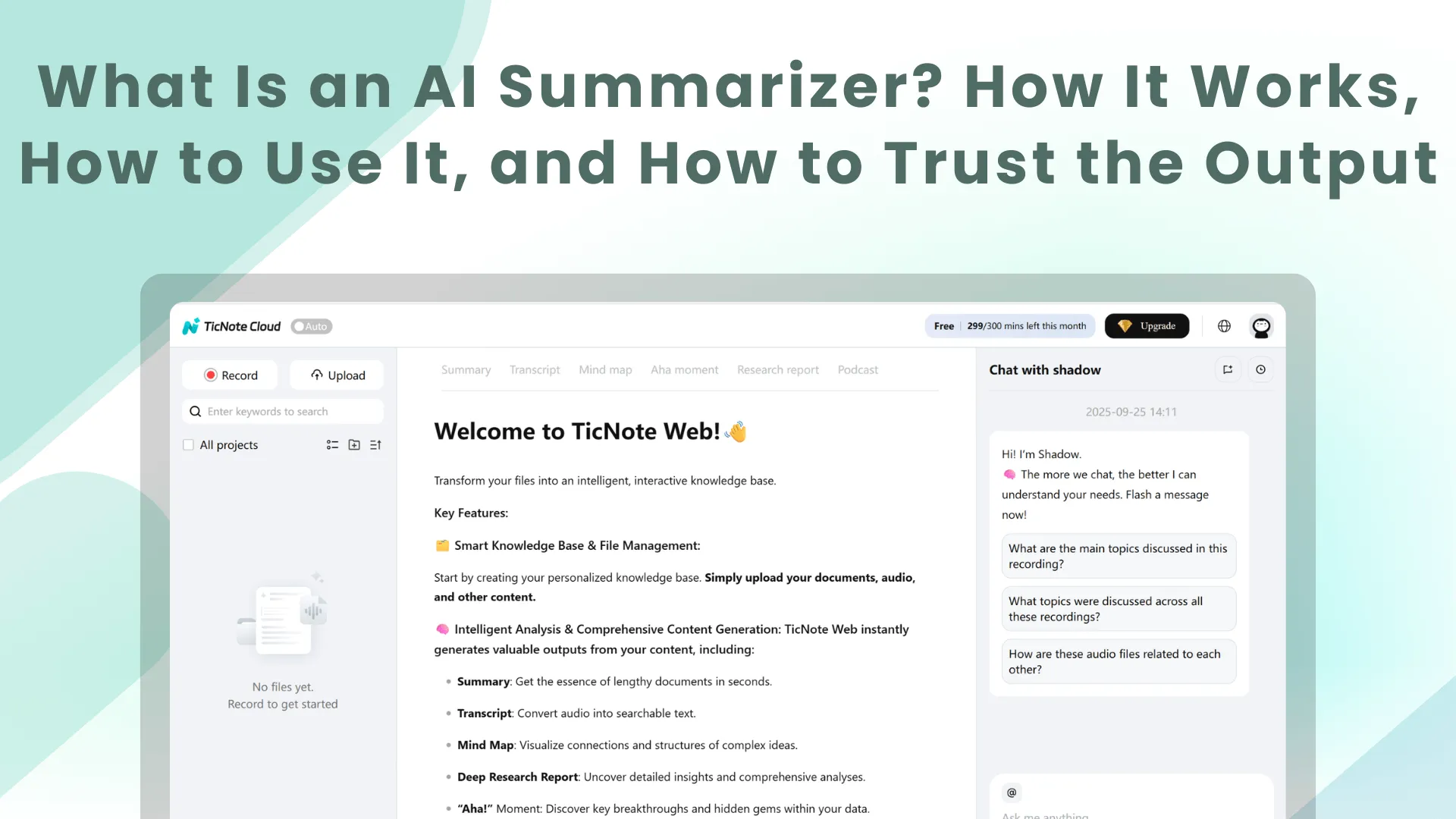 This workflow shows how to summarize meetings and documents in TicNote Cloud, but the same steps work in most tools: upload, summarize, verify, then reuse. The goal is simple: turn long audio, video, PDFs, and docs into clean recaps, decisions, and action items you can trust.