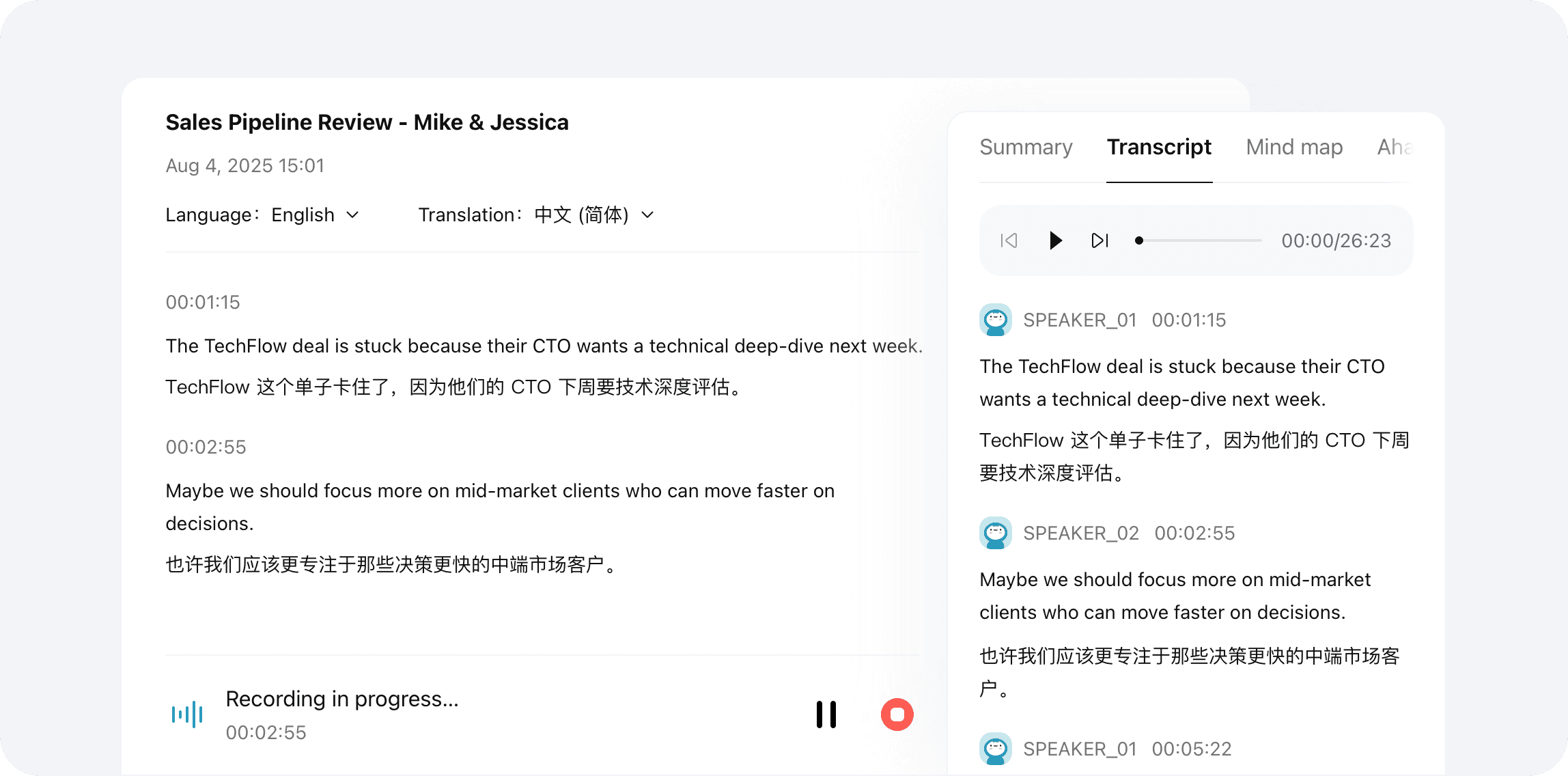 45分の部門会議を録音し、作成された議事録は明確で正確でした。転送、文字起こし、要約に2分かかり、毎会議後にノートを入力するよりもはるかに速いです。もう一つの予想外の利点は、ノートを取る代わりに会議中に完全に参加できることです。